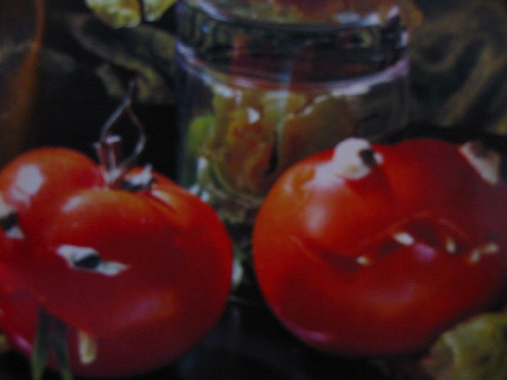 | Mit einen sehr scharfen Küchenmesser abbildungsgemäß Mund und Augen in die Tomaten schnitzen. Als Zähne die Pinienkerne ins Maul setzen. Aus Mayonnaise und Kapern die Augen formen. | ||