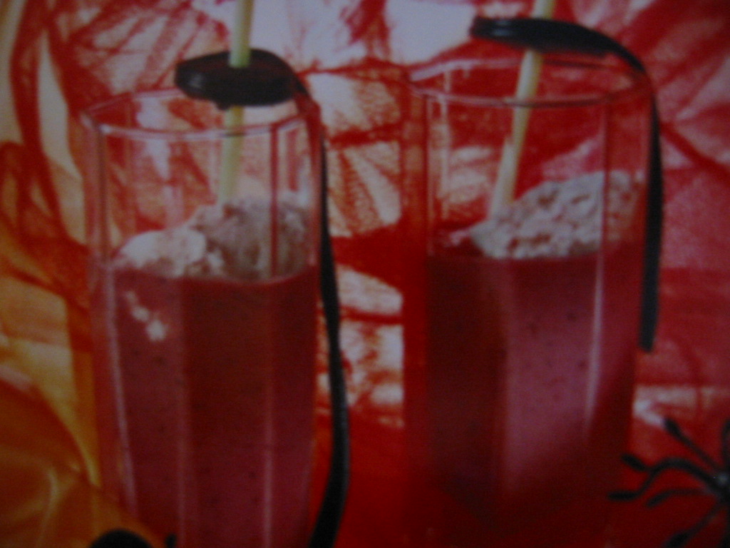 | Joghurt und Milch zusammen mit den aufgetauten Beeren im Mixer zu einem dickflüssigen blutroten Getränk verrühren. Mit Vanillezucker und Zucker abschmecken. In hohe Gläser füllen und in jedes Glas eine Kugel Erdbeereis geben. Mit Strohhalm und der Lakritzschnecke siehe Foto dekorieren. | ||